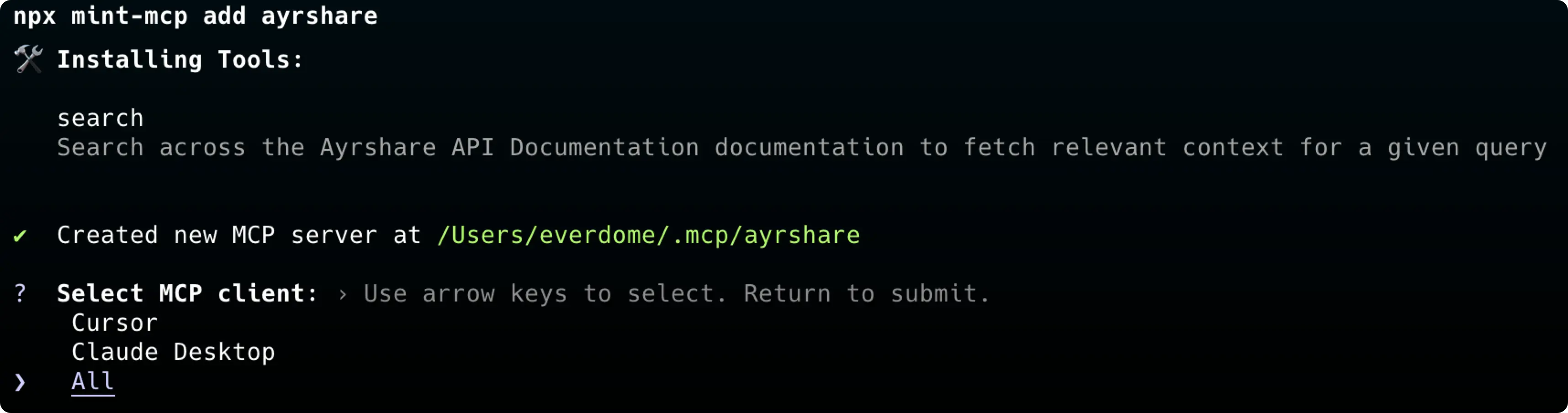 You may choose the apps to install the MCP connector, such as Cursor, Claude Desktop, or All.