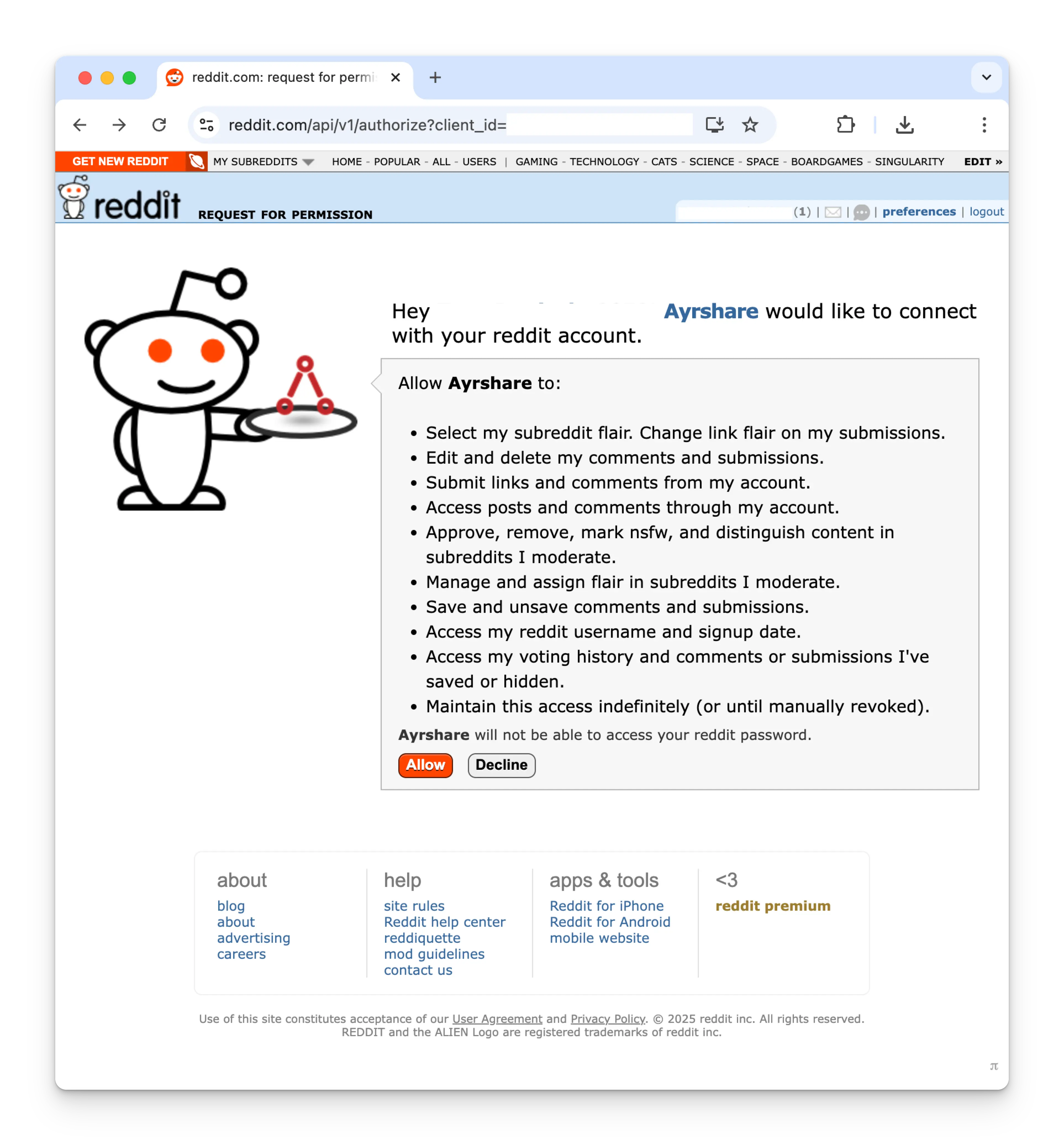 Authorize AccessAllow permissions for ACME to connect to your Reddit account by clicking Allow.