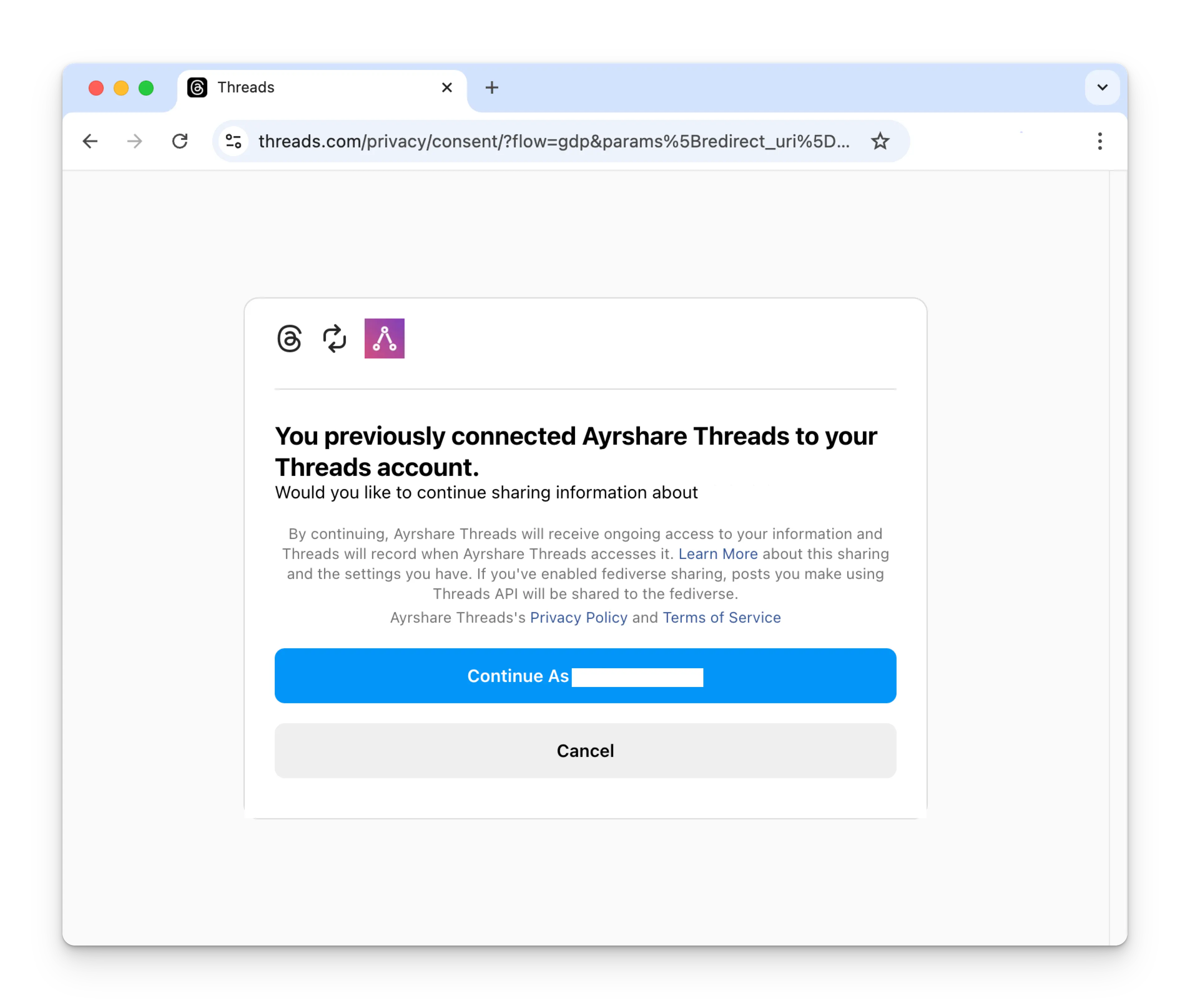If you have previously connected ACME with Threads, please click the Continue button to relink your Threads account.