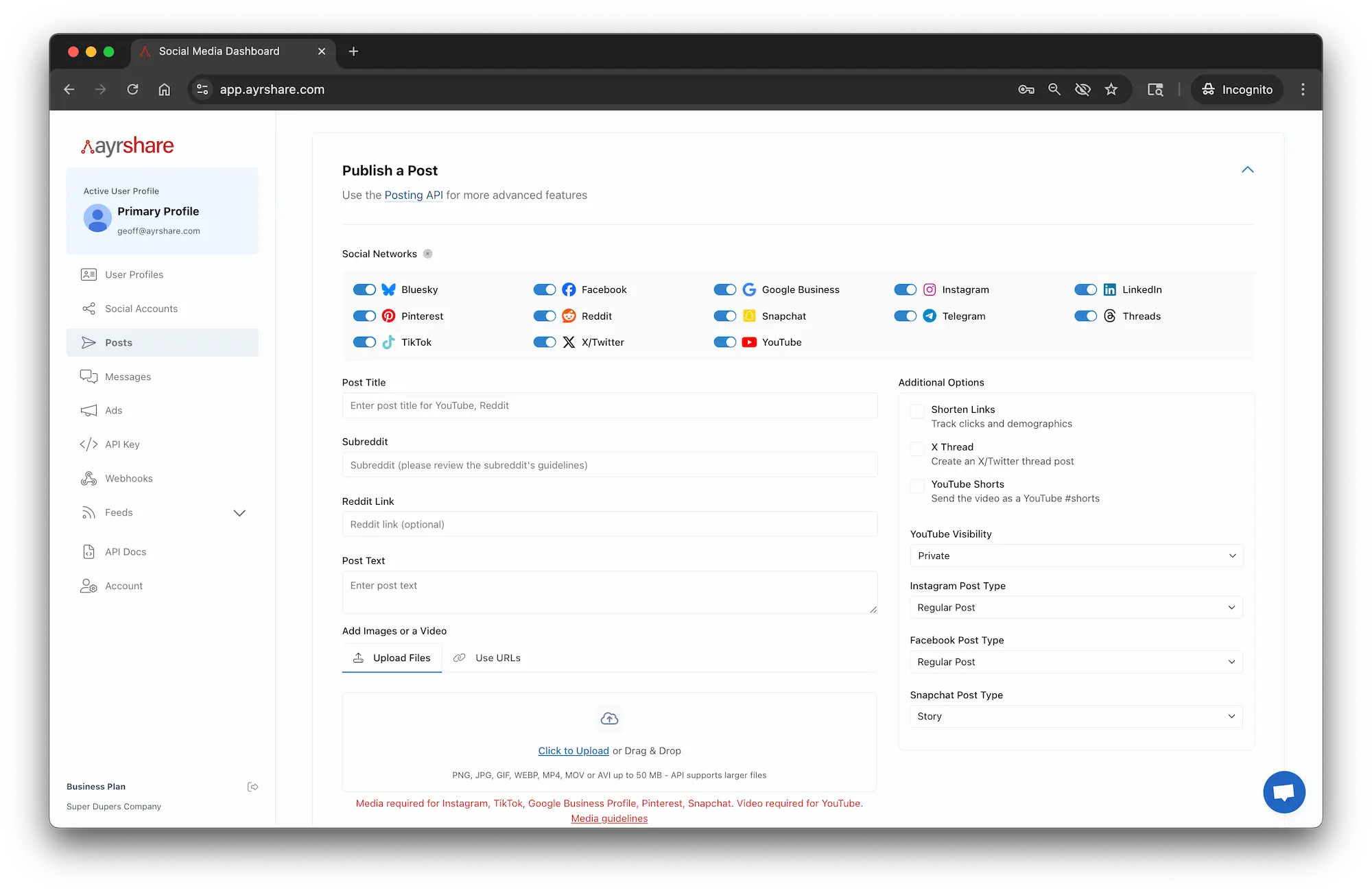 For direct social media management, users can manually publish posts to any connected platform and track their social media activities. The dashboard maintains a comprehensive history of all posts, including the JSON request and response for each interaction, making it invaluable to developers for testing and troubleshooting purposes.