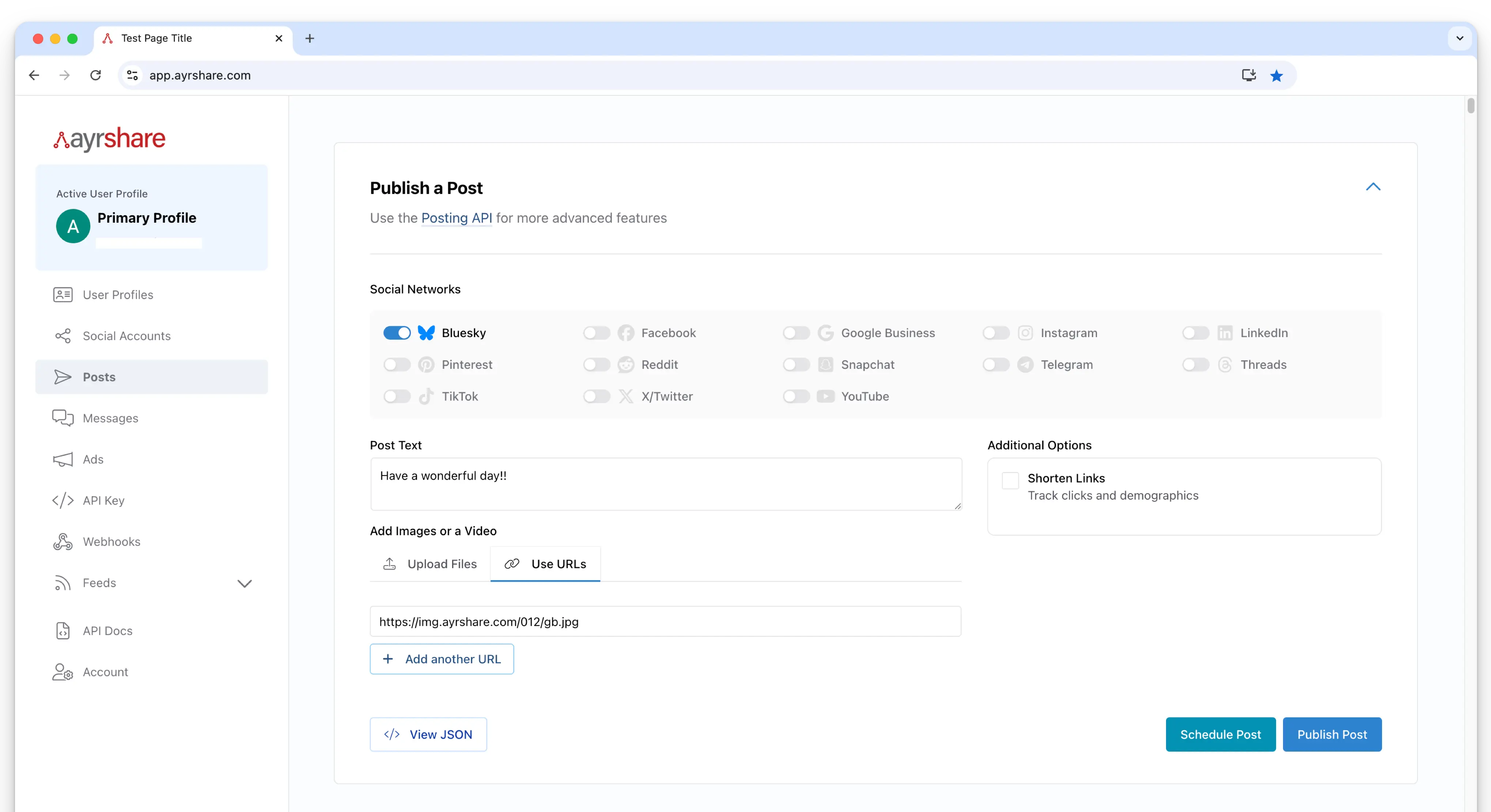 In the ACME Dashboard, navigate to "Posts" in the left-hand navigation. Create a new post by selecting your desired social networks, post text, and media.