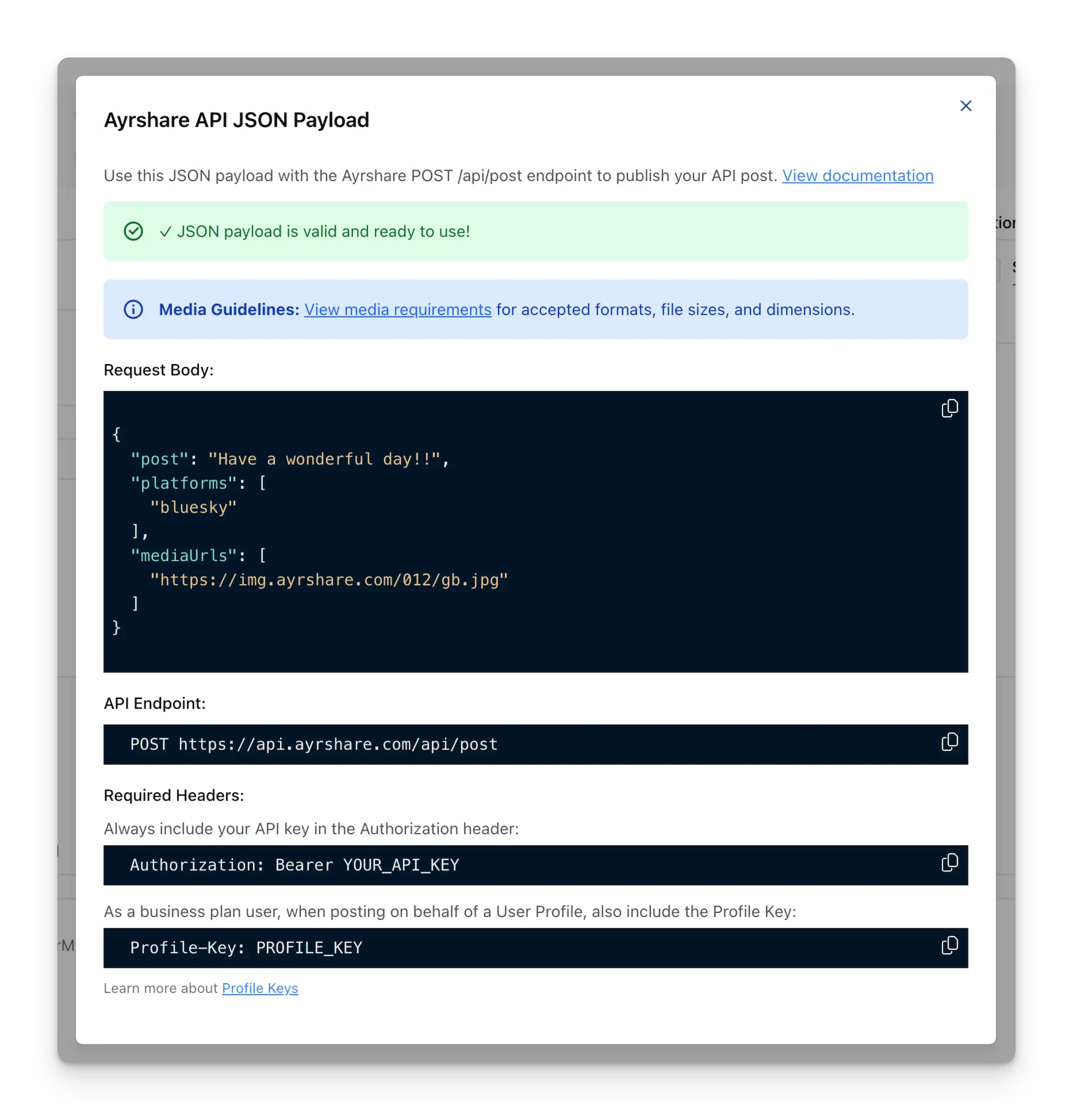 The JSON payload will appear in a modal, showing all the parameters and data that will be used for your post.