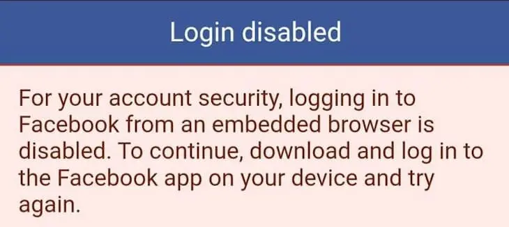 "For your account security, logging in to Facebook from an embedded browser is disabled. To continue, download and log in to the Facebook app on your device and try again."