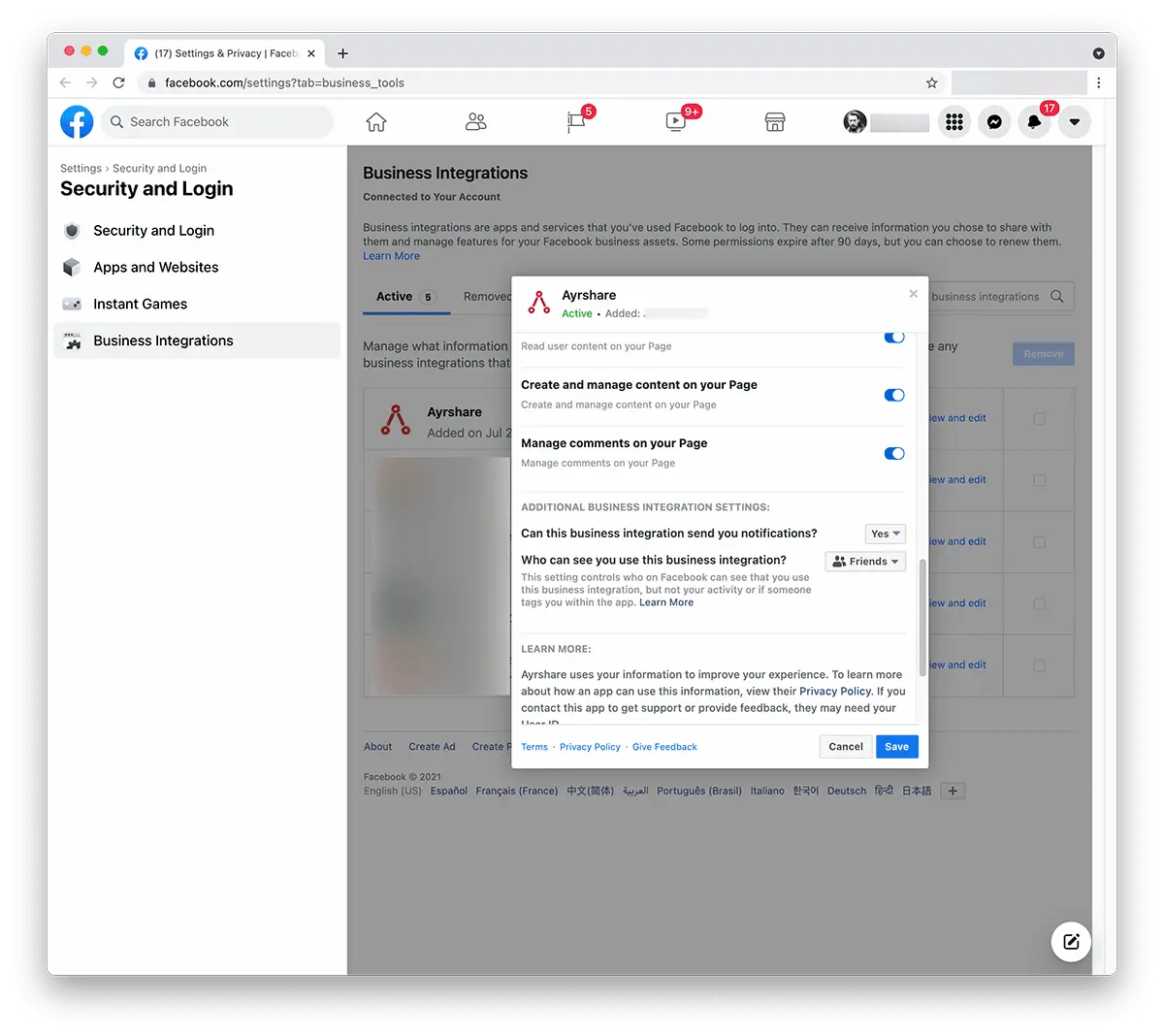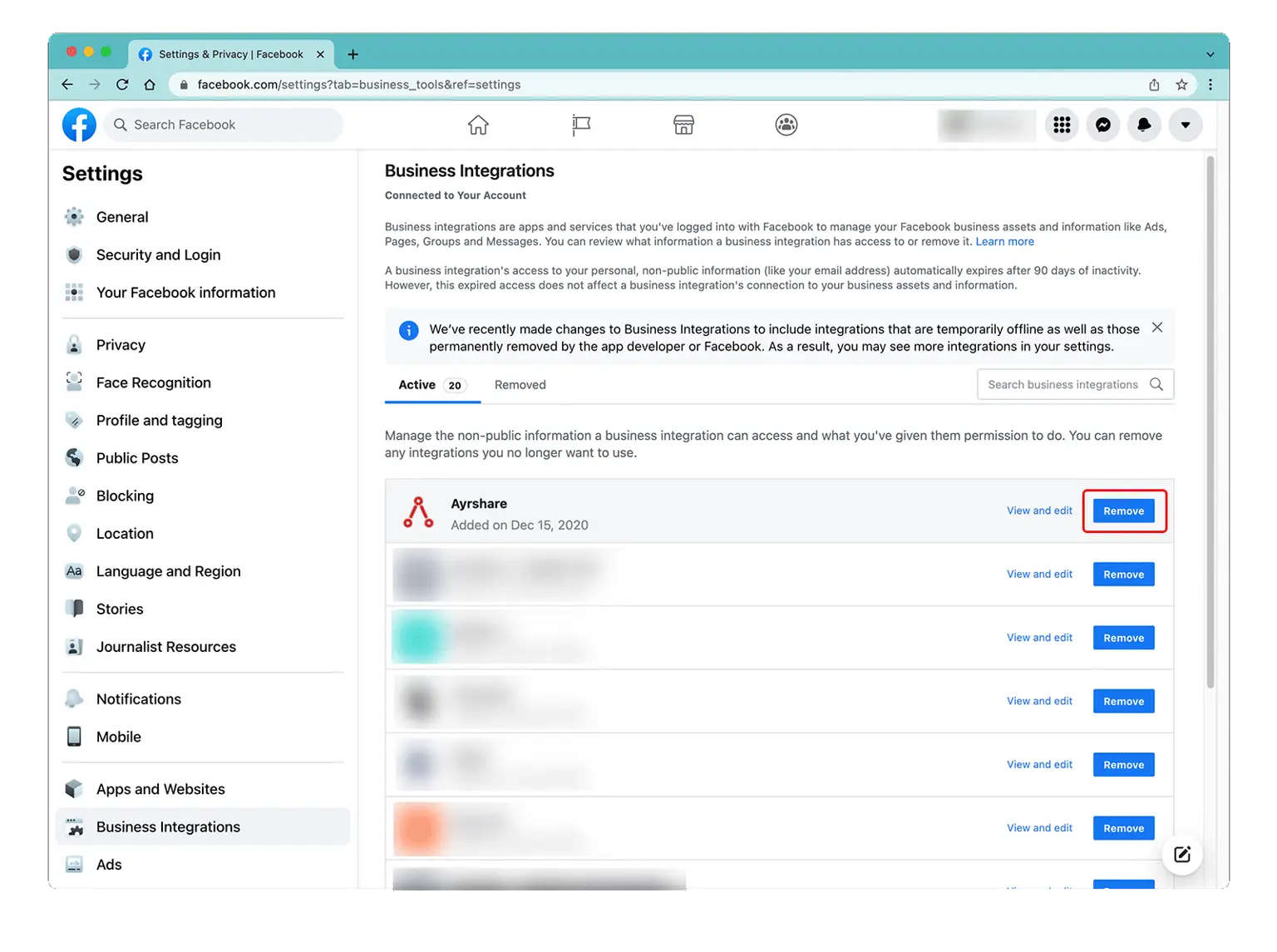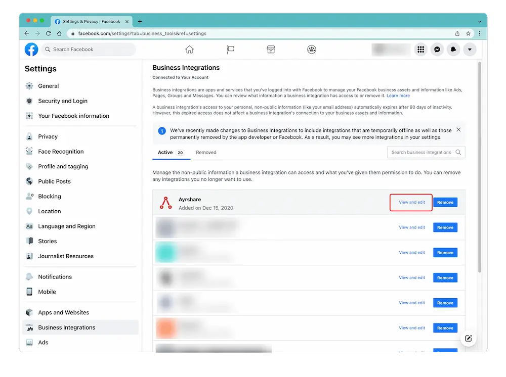 Access the Business Integration page by logging into Facebook and go to "Setting" -> "Settings & Privacy" -> "Security & Login" -> "Business Integration".