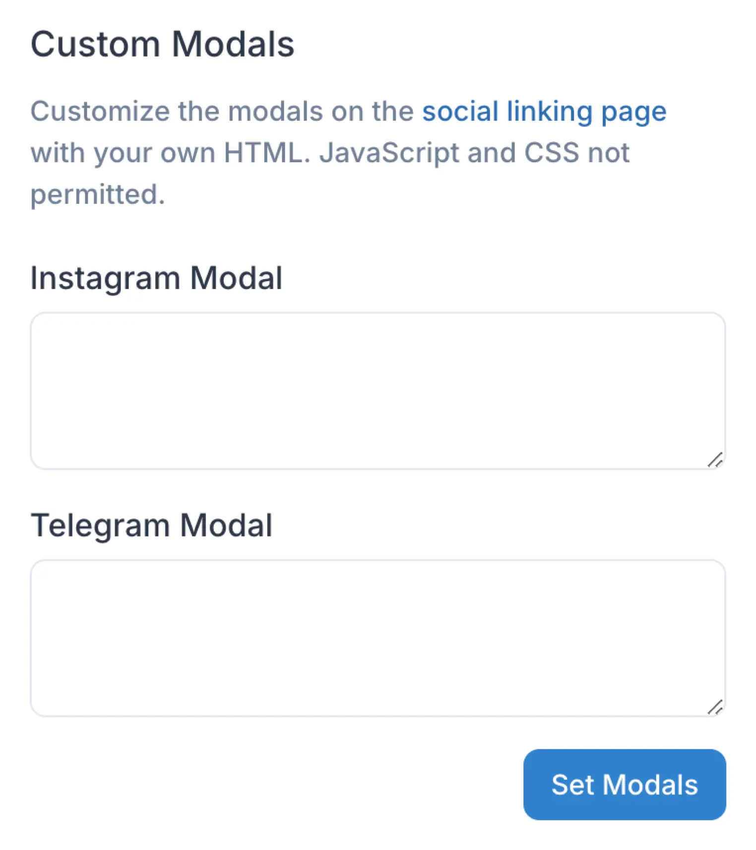 You can customize the content shown in the modals that appear on the social linking page. Specifically, you can replace the body content of both the Instagram and Telegram modals with your own custom HTML content, such as displaying the content in different languages. Your custom content can include formatted text, images, or a combination of both to better suit your needs.