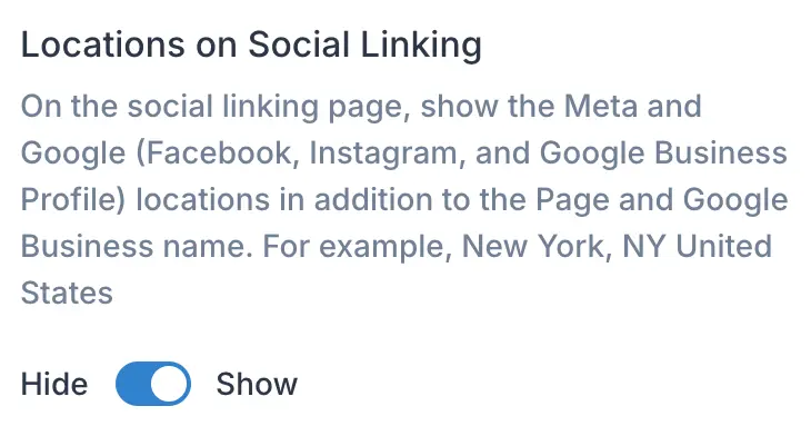On the social linking page, if a Meta (Facebook or Instagram) or Google Business Profile Page has a location associated with it, display that location information along with the Page name. This additional location context is helpful in scenarios where there are multiple Pages with identical names, as it allows users to differentiate between them more easily.
