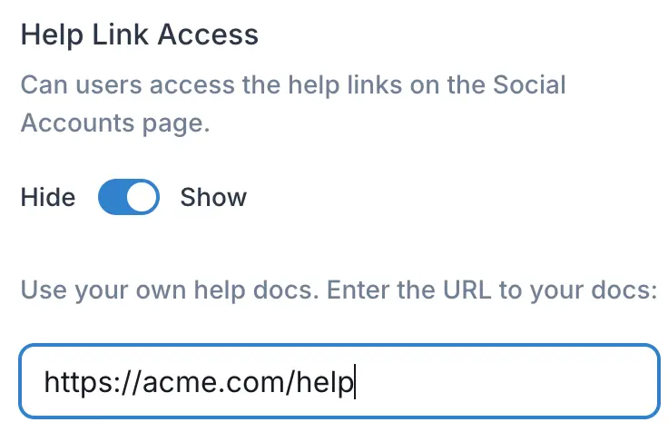 Enable or disable visibility of the links to the ACME help docs on your users' social linkage page. You can also use your own by entering a URL to your publicly available docs.