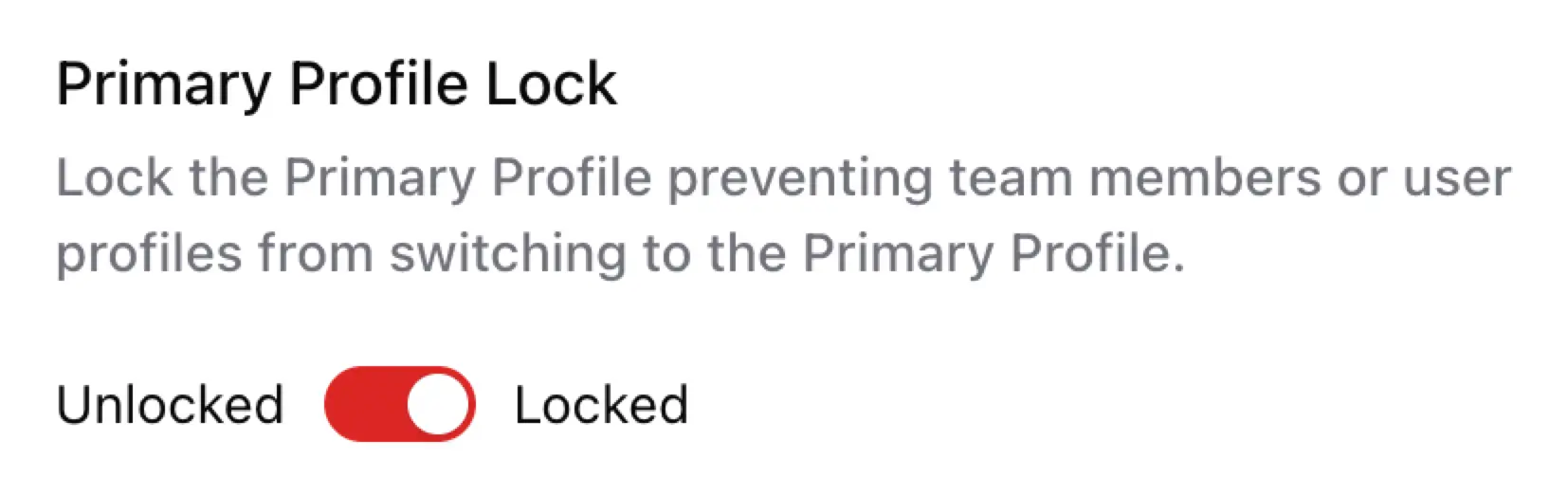 Restrict access to the Primary Profile from user and team member profiles by locking the Primary Profile. Activate the Primary Profile lock if you want to prevent team members or user profiles from accessing Profile Settings or the Account/Billing page.