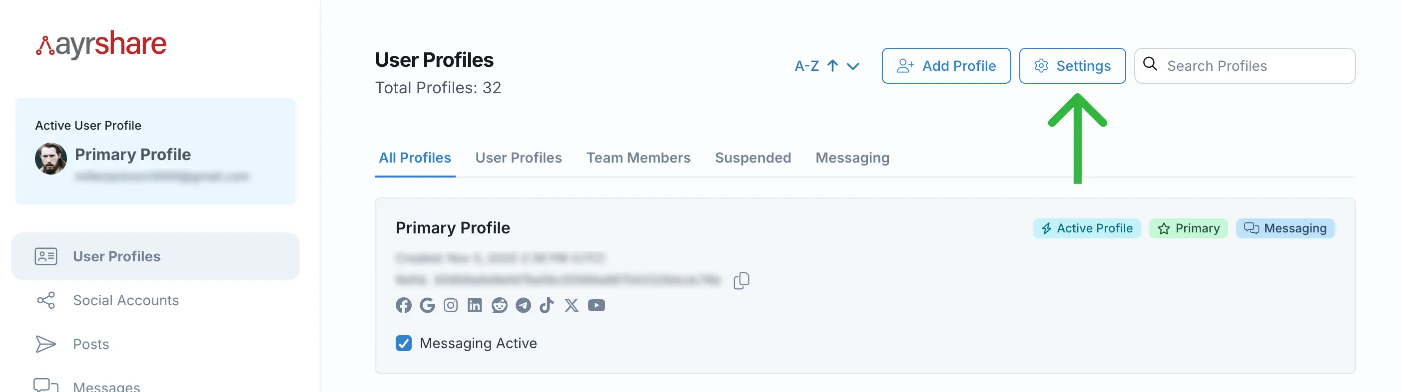 In the User Profiles page select "⚙️ Settings" button to access global settings for your profiles. Be sure to first switch to your Primary Profile to access the settings.