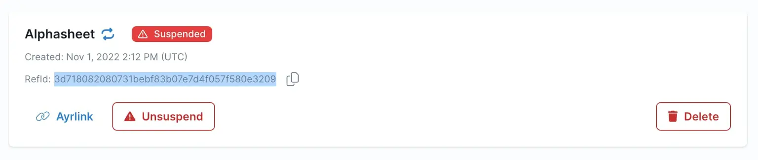 - Find the suspended User Profiles by clicking the "Suspended" tab or searching by the RefId of the User Profile, which is included in the email.