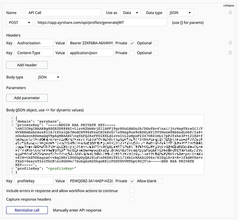 Step 2: In your Bubble app, create a new call with the API Connector as shown below. The text in the privateKey field in the Body area is the stringified text that you created in step 1 above.