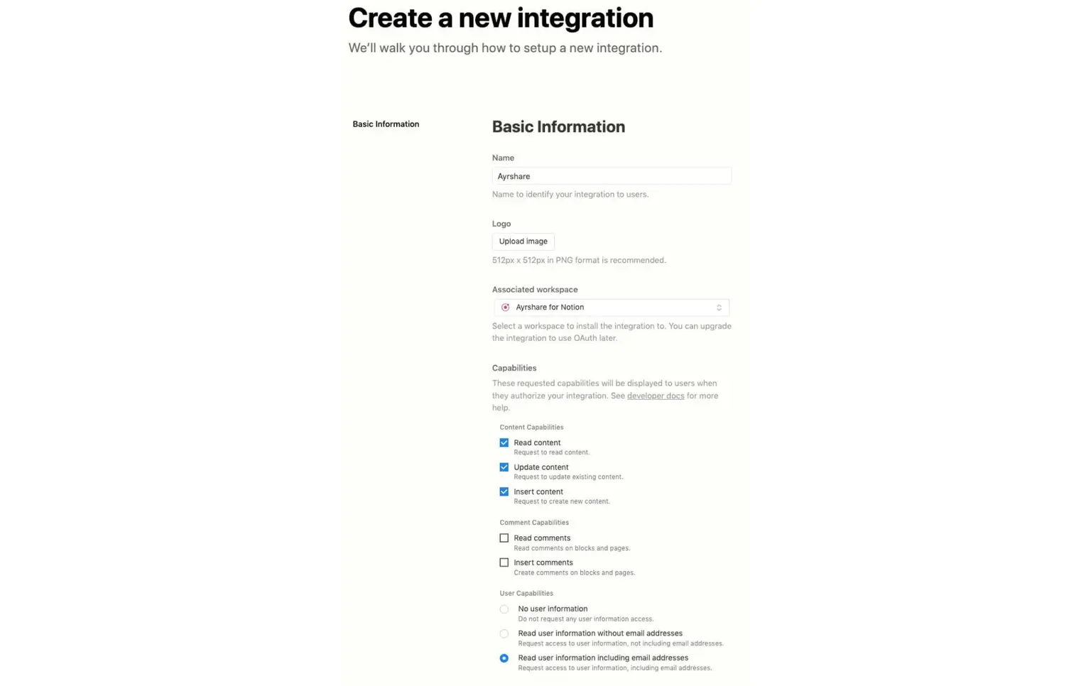 Finally, the default capabilities that have been selected for you will do. Submit to create the integration.